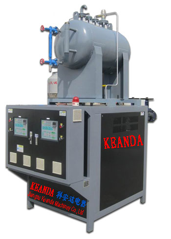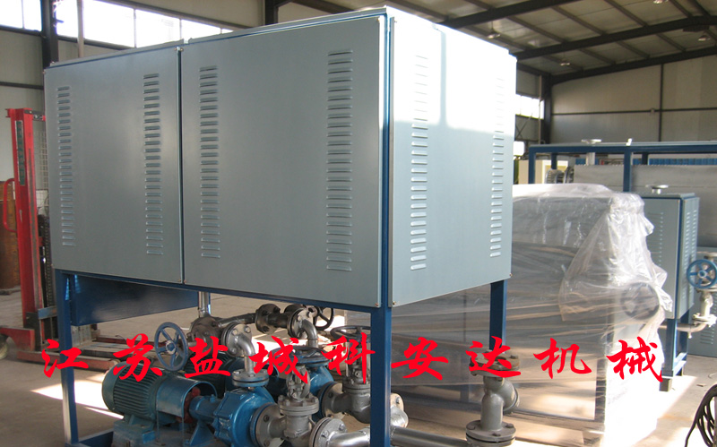 導(dǎo)熱油爐(又稱導(dǎo)熱油加熱器)是將是將電加熱器直接插入有機(jī)載體(導(dǎo)熱油)中直接加熱,利用循環(huán)泵,強(qiáng)制導(dǎo)熱油進(jìn)行液相循環(huán),將熱量傳遞給用一個或多種用熱設(shè)備,經(jīng)用熱設(shè)備卸載后,重新通過循環(huán)泵,回到加熱器,再吸收熱量,傳遞給用熱設(shè)備,如此周而復(fù)始,實現(xiàn)熱量的連續(xù)傳遞,使被加熱物體溫度升高,達(dá)到加熱的工藝要求。